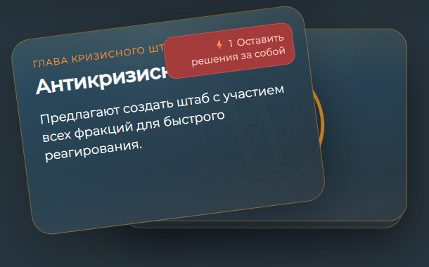 В процессе игры вам необходимо принимать решения, которые позволят вам сохранить контроль над ситуацией и фракциями. Принятие любого из решений требует символического количества энергии.